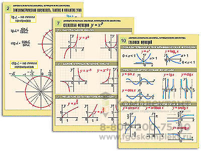Комплект учебно-наглядных пособий формата А1 с полноцветной двухсторонней печатью и матовой двухсторонней ламинацией в количестве 14 таблиц: 1. Тригонометрическая окружность. Синус и косинус угла. 2. Тригонометрическая окружность. Тангенс и котангенс угла. 3. Тригонометрические функции (1). 4. Тригонометрические функции (2). 5. Обратные тригонометрические функции (1). 6. Обратные тригонометрические функции (2). 7. Степенная функция y = xp. 8. Показательная функция. 9. Логарифмическая функция. 10. Графики функций. 11. Взаимно-обратные функции. 12. Свойства функций. 13. Асимптоты графиков функций. 14. Схема исследования функции y = f ( x ).