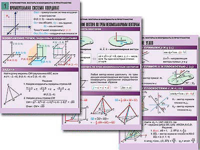 Комплект учебно-наглядных пособий формата А1 с полноцветной двухсторонней печатью и матовой двухсторонней ламинацией в количестве 8 таблиц: 1. Прямоугольная система координат. 2. Линейные операции над векторами. 3. Скалярное произведение векторов. 4. Разложение вектора по трем некомпланарным векторам. 5. Вычисление углов. 6. Уравнение плоскости. 7. Уравнение сферы. 8. Векторный и координатный методы решения задач.