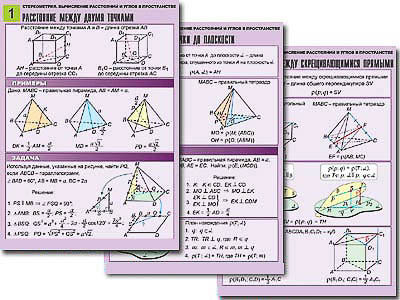 Комплект учебно-наглядных пособий формата А1 с полноцветной двухсторонней печатью и матовой двухсторонней ламинацией в количестве 8 таблиц: 1. Расстояние между двумя точками. 2. Расстояние от точки до прямой. 3. Расстояние от точки до плоскости. 4. Расстояние между скрещивающимися прямыми. 5. Угол между скрещивающимися прямыми. 6. Угол между прямой и плоскостью. 7. Двугранные углы. 8. Угол между двумя плоскостями.