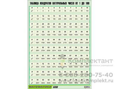 Таблица демонстрационная Таблица квадратов натуральных чисел от 1 до 100 (винил 100х140)