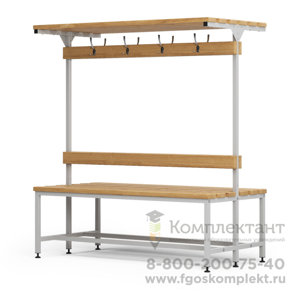 Очень прочная и долговечная двухсторонняя скамья со спинкой и вешалкой и полкой для шапок.