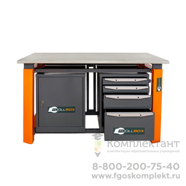 Двухтумбовый, комбинированный, одна тумба комплектуется 4-мя выдвижными ящиками, имеет петли для запирания на навесной замок, другая тумба комплектуется 2-мя полками, закрывается на врезной замок.