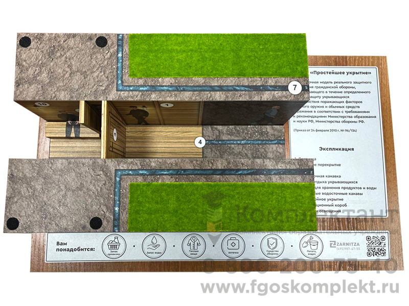 3D-макет "Простейшее укрытие" представляет собой масштабную планировочную модель реального защитного сооружения гражданской обороны, обеспечивающее в течение определенного времени защиту укрываемых от воздействия поражающих факторов ядерного оружия и прочих средств поражения в соответствии с требованиями и рекомендациям Министерства образования и науки РФ и Министерства обороны РФ (приказ от 24 февраля 2010 г. № 96/134), изготовленный с соблюдением всех объективных размеров и пропорций.