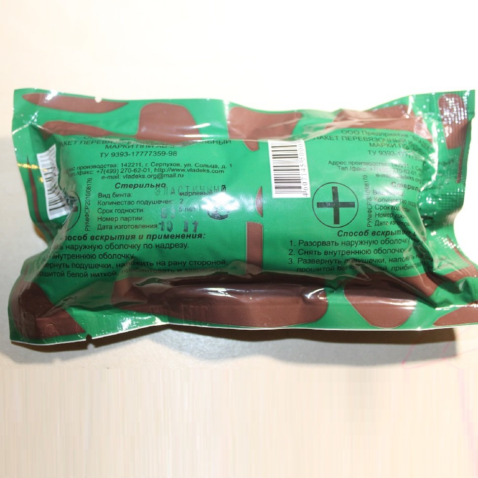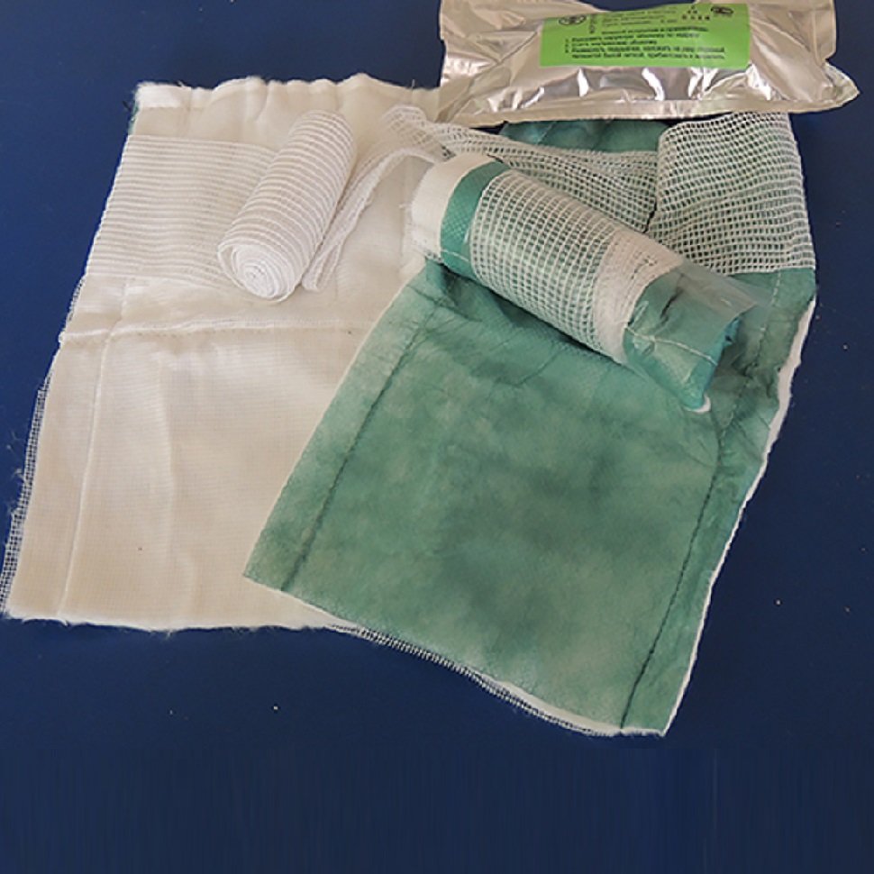 Для надежного и оперативного наложения повязки (подушечки) пакета на любые участки тела, в том числе и со сложной конфигурацией применяется и марлевый бинт, а так же эластичный бинт, который может выполнять и роль компрессии. Причем, закрепление эластичного бинта при фиксации повязки осуществляется с помощью липучки – быстро и удобно.