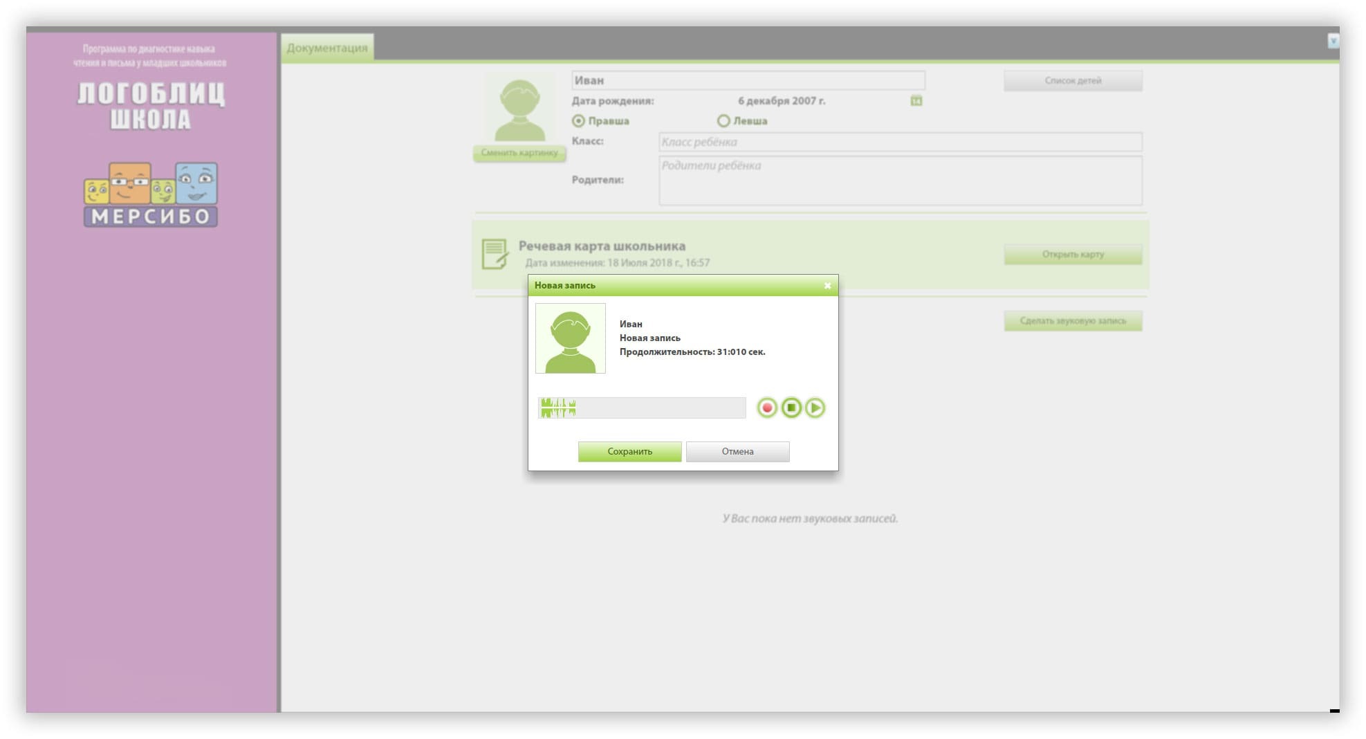 Программа состоит из трёх блоков, с помощью которых можно провести обследования. Первый блок - речевая карта. С помощью этой функции можно исследовать уровень письменной речи чтения у ребёнка, а после вывести результат. Второй блок - диаграмма. С помощью этой функции вы можете вывести результаты для наглядного отображения. Видеть карту обследования полностью (проблемные места ребёнка) и продемонстрировать её родителям или другим специалистам. Третий блок - звуковой журнал. Эта функция позволит делать звуковые записи голоса ребёнка, проводить анализ звукопроизношения и вести список всех аудиозаписей.