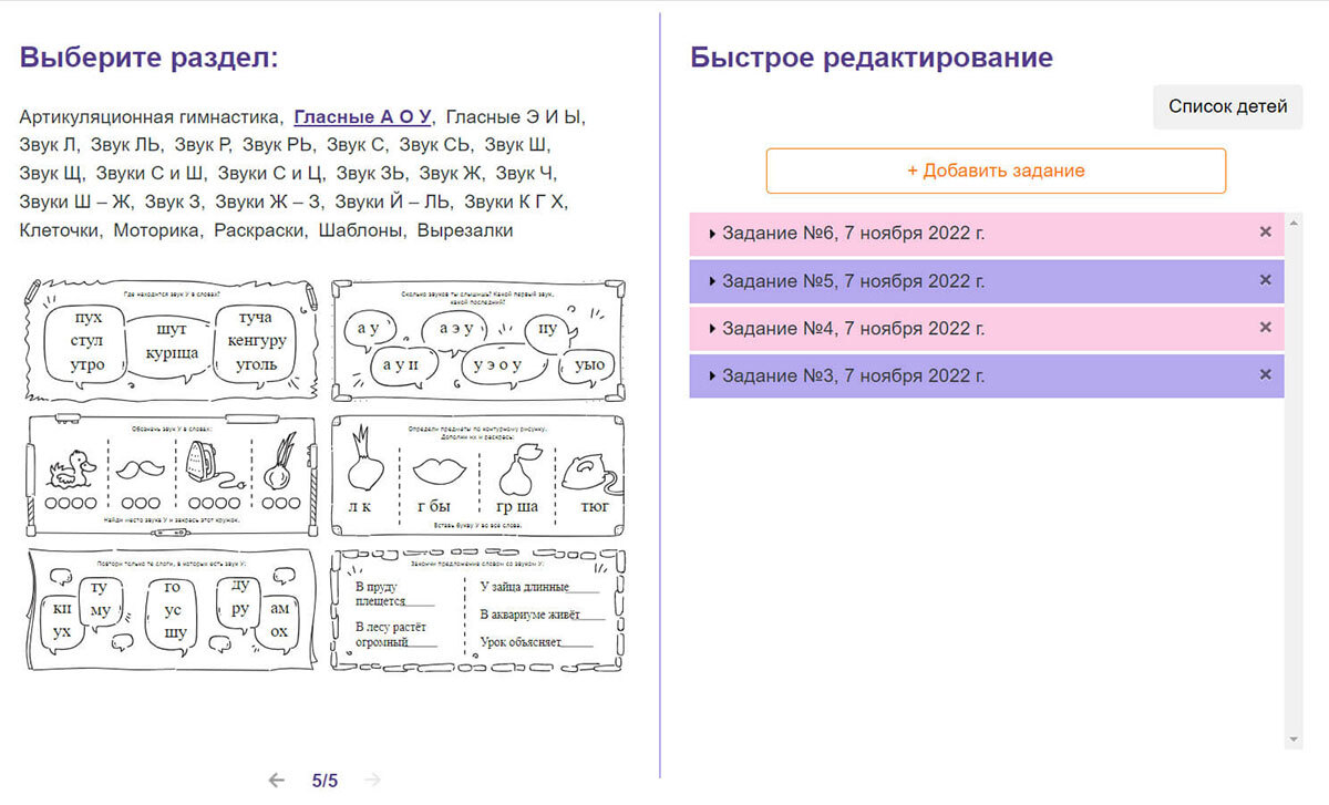 "Генератор логопедических заданий" поможет подготовить задание на дом за 1 минуту: для работы над артикуляционной и мелкой моторикой, постановки и автоматизации звуков, развития звуко-буквенного анализа.