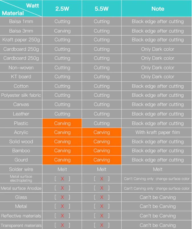 Обрабатываемые материалы | бальса, крафт, картон, ПВХ, полиэстер, холст, кожа, пластик, акрил, массив дерева, бамбук |