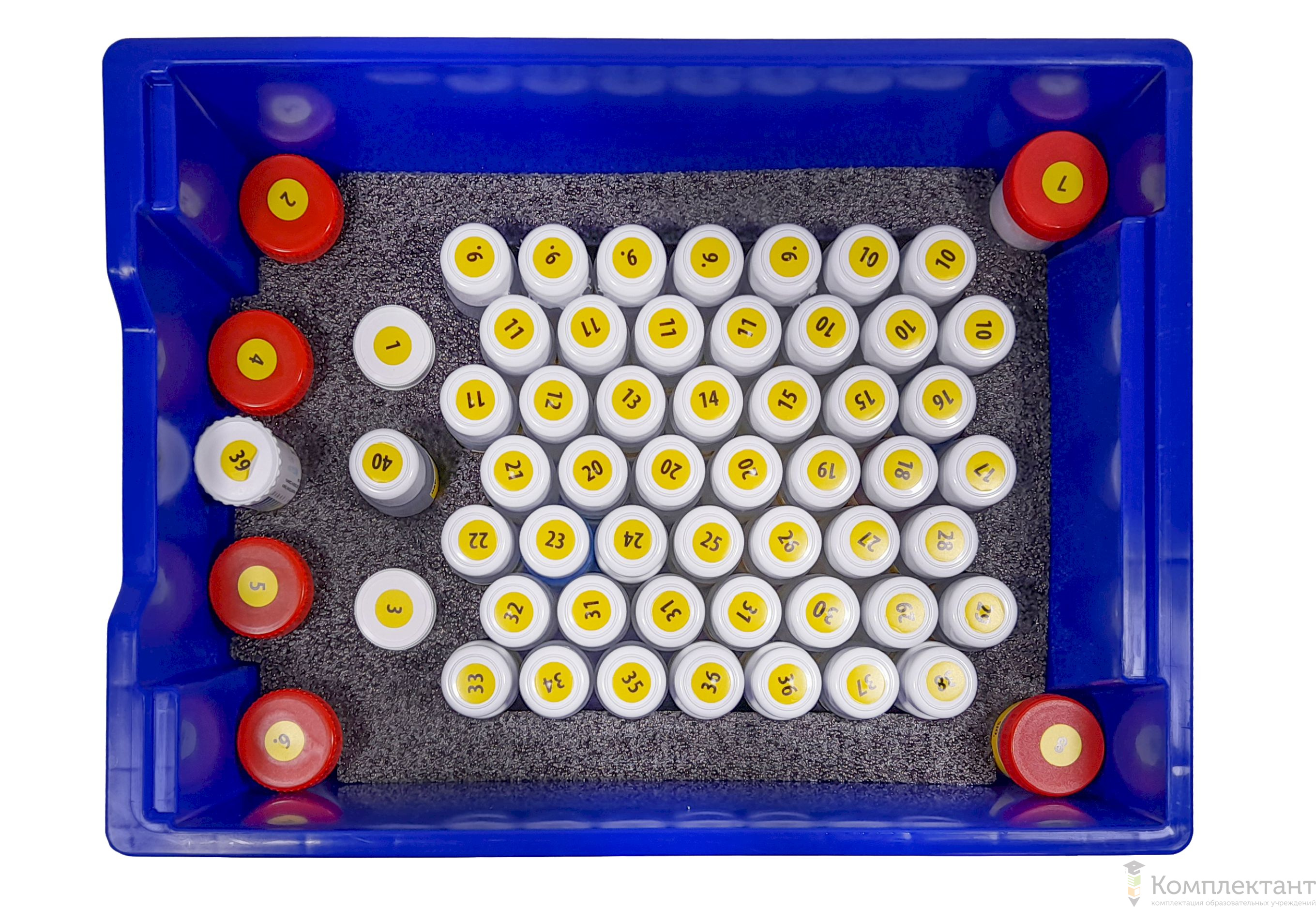 Сухие вещества в пластиковых баночках с завинчивающейся крышкой. Все флаконы и баночки с реактивами имеют наклейку с названием и формулой вещества внутри.